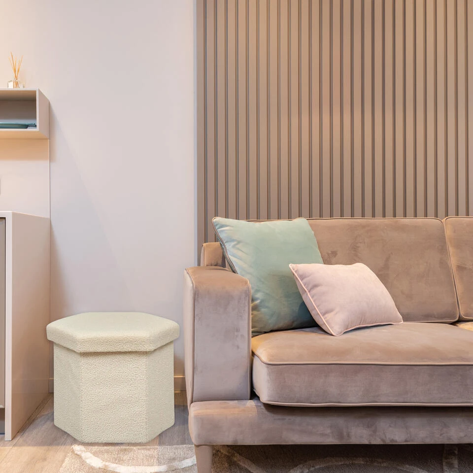 Poef/krukje/hocker, model Jako, in een zeshoekige originele vorm. De vulbare poef is opvouwbaar tot plat en is tevens een opslag box voor spullen met deksel. Kleur stof: ivoor wit. Materiaal: MDF en polyester lammy stof. Afmetingen: Dia 40 x H38 cm. Gasten bijzet krukje voor als u extra zitplaatsen nodig hebt. Altijd handig om thuis te hebben staan. Geschikt voor kinderen en volwassenen. De opslagruimte is 60 liter. Als u deze niet meer gebruikt, klapt u deze eenvoudig in, zodat het weinig ruimte inneemt.