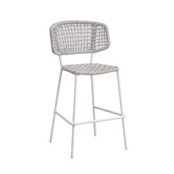 Deze buiten barkruk is gemaakt van wit metaal in combinatie met polyester. Het touw zit gevlochten rondom de rugleuning zitting oogt stijlvol. Het voordeel van polyester touw is dat dit ideaal is voor buiten stoelen. Het touw zal snel drogen na een regenbui.Â