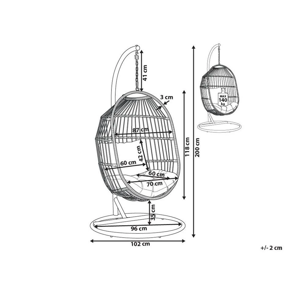 Ronde hangstoel met stalen frame voor binnen en buiten, inclusief kussens. Het opvallende ontwerp van deze hangstoel van robuust polyrotan en polyester zorgt voor een romantisch en zorgeloos vakantiegevoel op de veranda of in de slaapkamer. De gevlochten stoel is opgehangen aan een zware metalen ketting, die op zijn beurt is bevestigd aan een zeer stabiel stalen frame. Zo biedt de stoel rustgevende, subtiele schommelingen en laat je zweven op het comfortabele, waterbestendige zitkussen, zoals op een wolk in de lucht.
