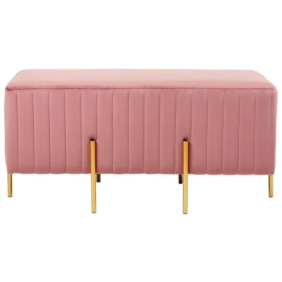 Voetenbankje met metalen poten. Dit gestoffeerde bankje is een chic stijlstatement dat een luxe factor toevoegt aan elk interieur. De rijke textuur van fluweel wordt prachtig geaccentueerd door verticale tufting, waardoor het stuk een glamoureuze uitstraling krijgt. Met zijn veelzijdige, rechthoekige vorm kan hij gebruikt worden in een gang, woonkamer of aan het voeteneind van een bed. De bank ziet er fantastisch uit als een enkel accentstuk en zou een passende aanvulling zijn op glamoureuze en eclectische interieurs.