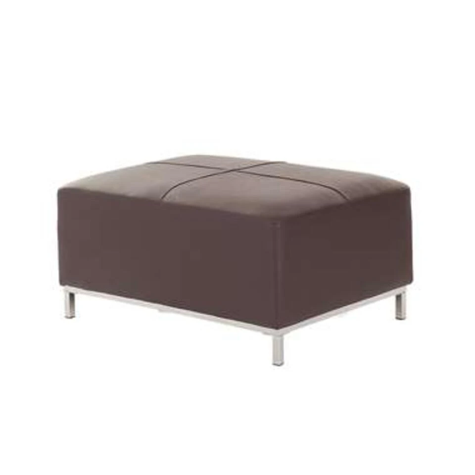 Bruine, elegante ottomaan. Deze poef is een echt prachtstuk. Je kunt ze in een set kopen met de bank, maar ze zijn vanwege hun populariteit ook afzonderlijk verkrijgbaar. De stevige, duurzame stoffen hoes is zorgvuldig genaaid en strak over de comfortabele voering getrokken. De verchroomde poten geven de ottomaan een modern tintje en vervolledigen het ontwerp.