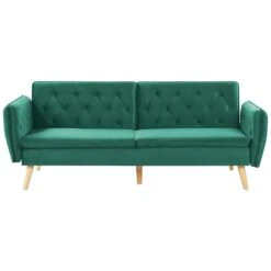 Decoratieve tweezits bank met praktische slaapfunctie. Deze unieke slaapbank is een uitstekende keuze voor iedereen die op zoek is naar functionele en decoratieve meubelstukken. De knoopstiksels geven de donkergroen bank een modern en glamoureus karakter, dat nog eens extra wordt benadrukt door de smalle armleuningen en de hoogwaardige fluwelen stof. De brede poten van rubberboomhout staan garant voor veel stabiliteit en zijn prachtig te combineren met alle inrichtingsstijlen van je woonkamer of logeerkamer.