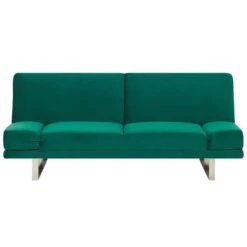 Moderne, groene slaapbank gemaakt met fluweel in Scandinavische stijl. Deze hoogwaardige stilistische bank is prachtig gestoffeerd en kan in enkele ogenblikken worden omgebouwd van een zit-meubel tot een heerlijk bed. De rugleuning van de slaapbank is eenvoudig neer te klappen, zodat er een lig-vlak ontstaat waarop je heerlijk kunt slapen of gewoon relaxen.