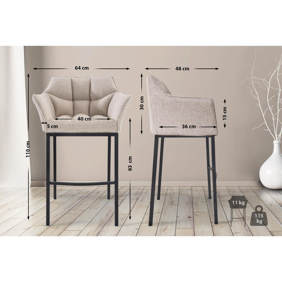 De Damaso barkruk combineert elegantie en comfort in perfecte harmonie. De gestoffeerde stoffen bekleding in modieuze kleuren voegt een tijdloos accent toe aan elke kamer, waardoor de kruk ideaal is voor de keuken, woonkamer, eetkamer en thuisbar.