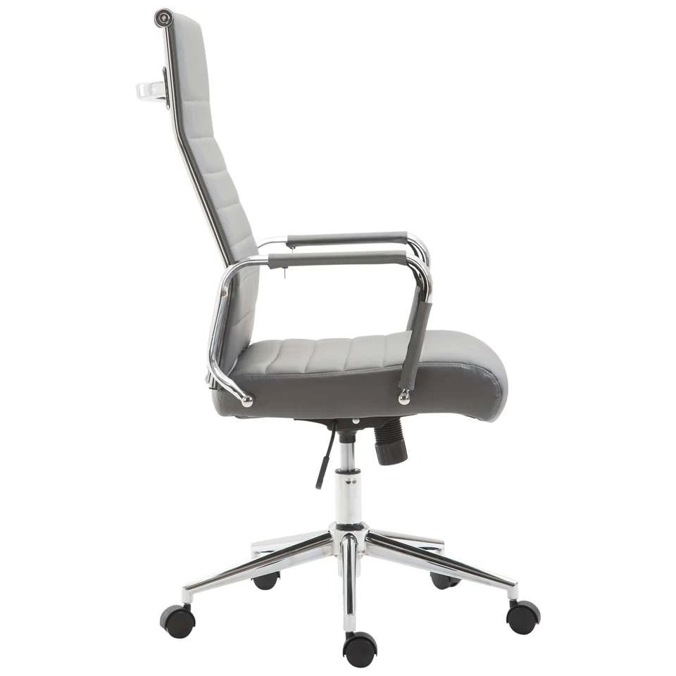 De exclusieve bureaustoel Columbus overtuigt niet alleen met zijn moderne uiterlijk, ook in termen van comfort kan niemand hem voor de gek houden. De hoogwaardige bekleding en de onderhoudsvriendelijke kunstlederen overtrek zorgen voor een aangename zitervaring. De zithoogte is traploos instelbaar en garandeert een ergonomische zitpositie. Bovendien is de bureaustoel uitgerust met een kantelmechanisme, dat meer bewegingsvrijheid biedt. Het elegante chromen frame en de stevige gebogen armleuningen met kunstlederen overkapping geven het geheel iets extra’s. De stabiliteit wordt verzekerd door het metalen frame in chroomlook.