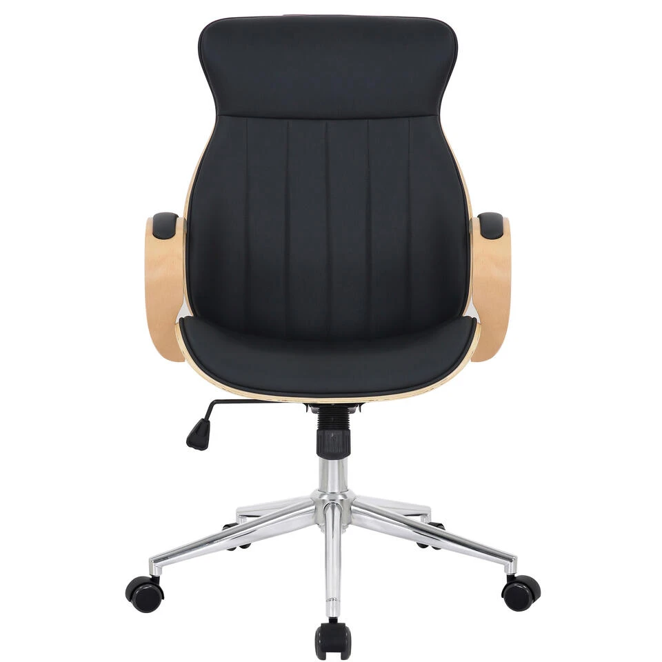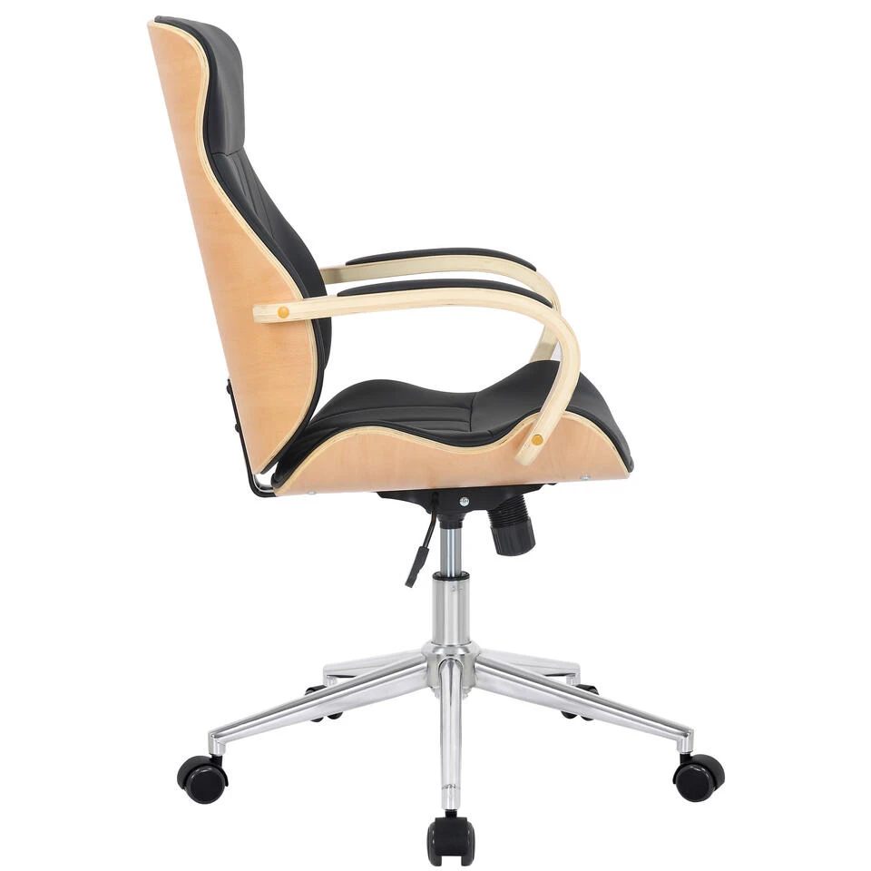 Deze bureaustoel heeft een zeer hoogwaardige kunstlederen bekleding. De kunstlederen hoes heeft het voordeel dat hij elastisch is en weer glad worden als ze ontlast worden. Dit ziet er niet alleen mooier uit, maar verlengt ook de levensduur van de stoelbekleding. Het houten frame maakt deze bureaustoel tot een absolute blikvanger en geeft hem een nobel design. Dankzij de traploze zithoogte is ergonomisch zitten gegarandeerd en zorgt het ingebouwde kantelmechanisme voor meer bewegingsvrijheid. Het frame is gemaakt van metaal in chroomlook en is zeer stabiel. De bureaustoel staat stevig op vijf zwenkwielen.