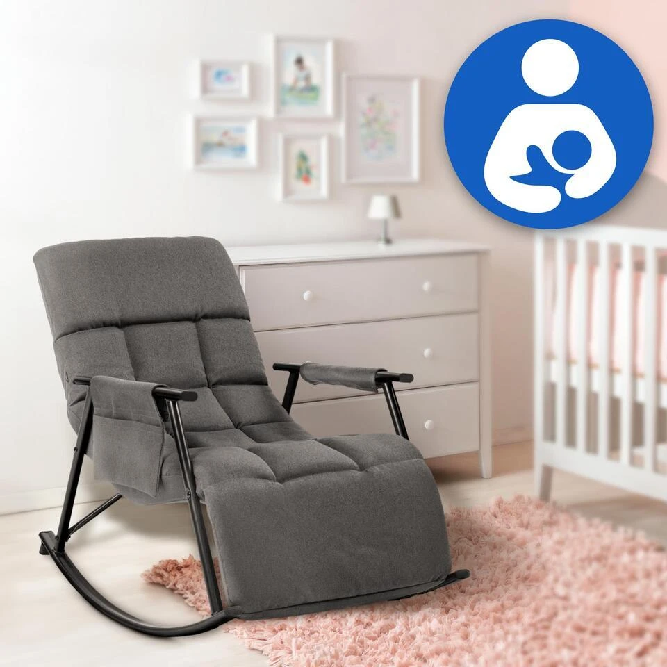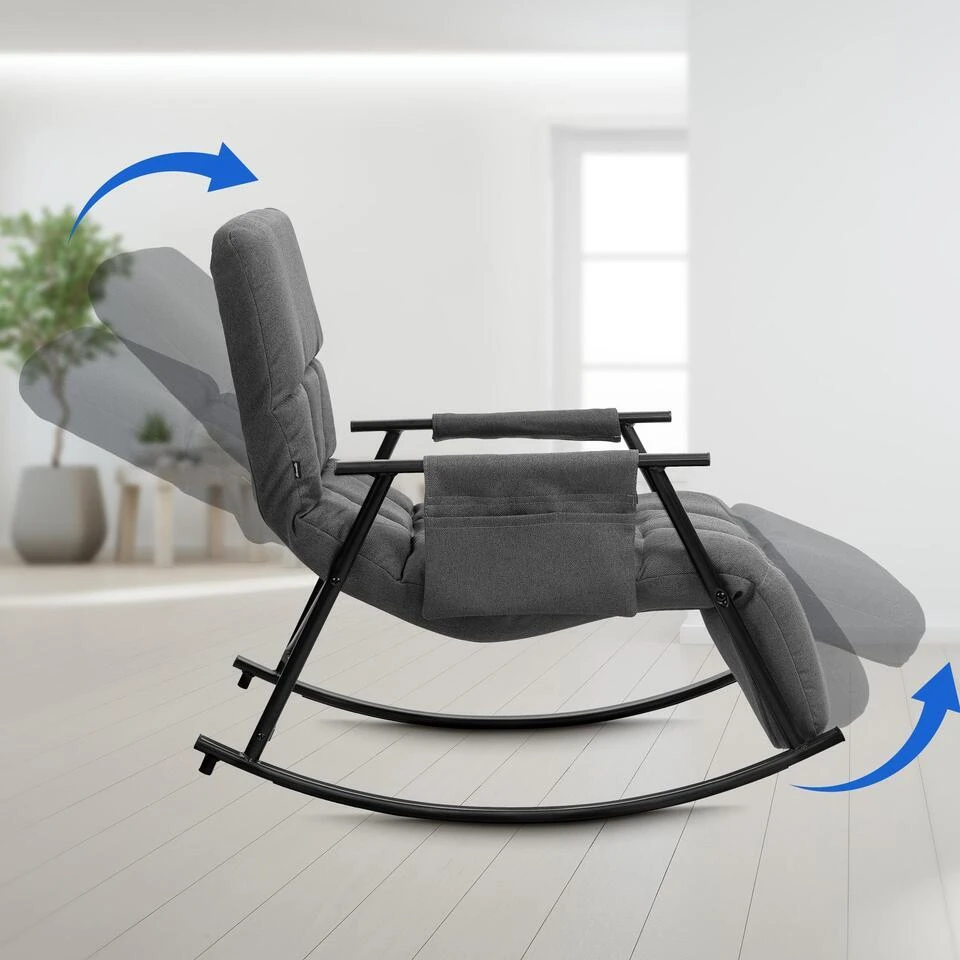 De bekleding met modieus doorgestikt patroon is verkrijgbaar met een stoffen of fluwelen hoes. Het gepoedercoate metalen frame draagt bij aan de moderne uitstraling en hoge stabiliteit. De schommelstoel kan een gewicht tot 125 kilo veilig dragen.