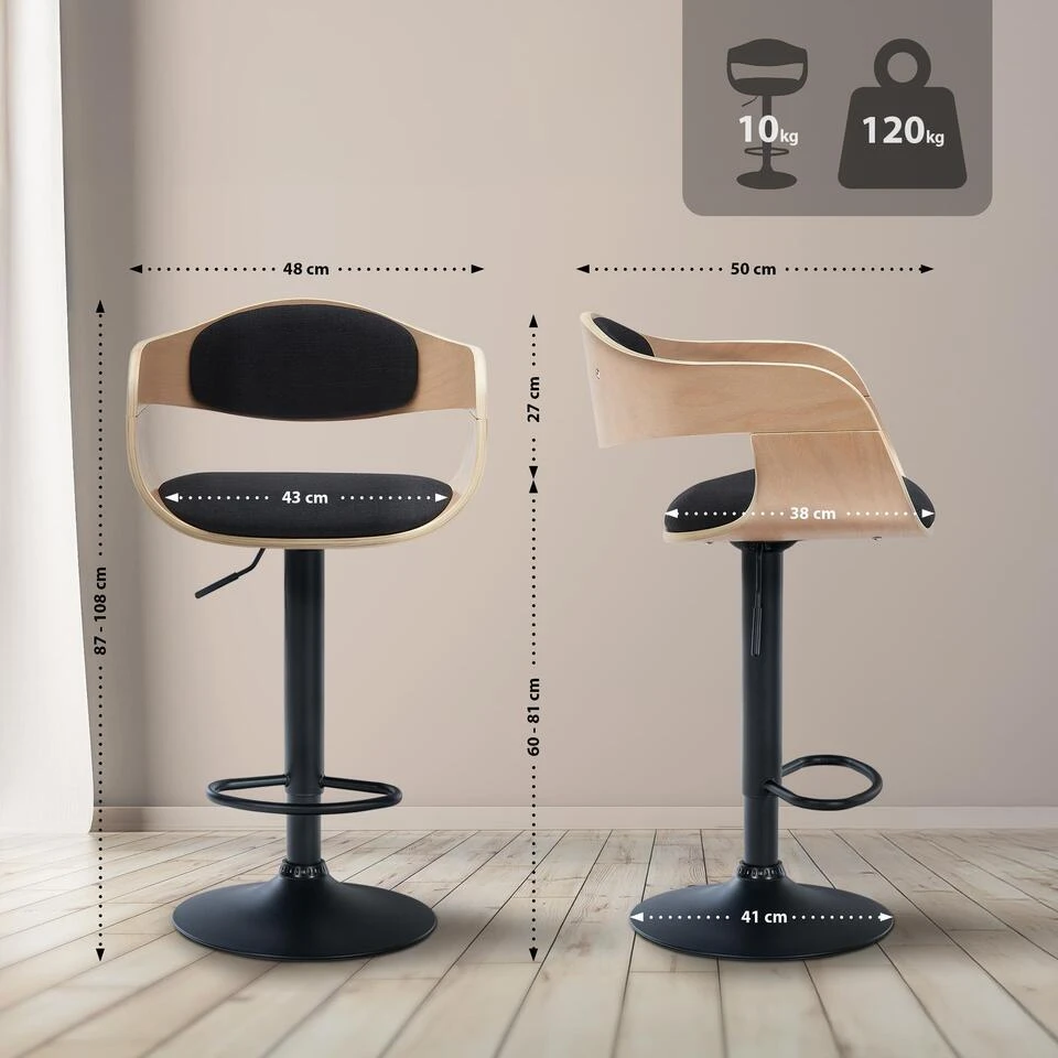 De barkrukken staan ??op robuuste frames van matzwart metaal. Dankzij een gaslift zijn de barkrukken traploos in hoogte verstelbaar en kunnen ze individueel worden aangepast aan elke lichaamsgrootte en baarhoogte. De geïntegreerde voetsteunen dragen bij aan een rechte en opgerichte zithouding.