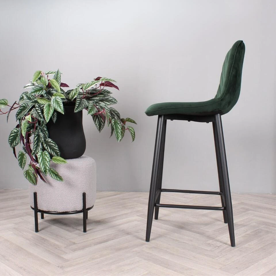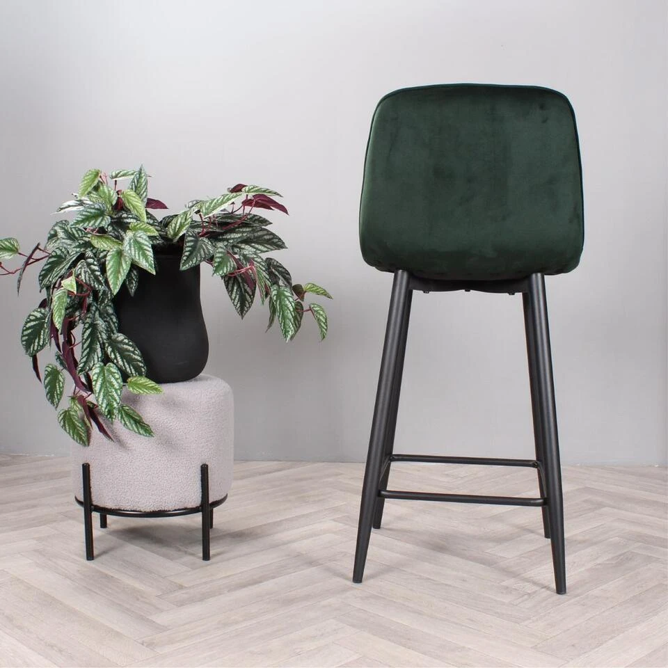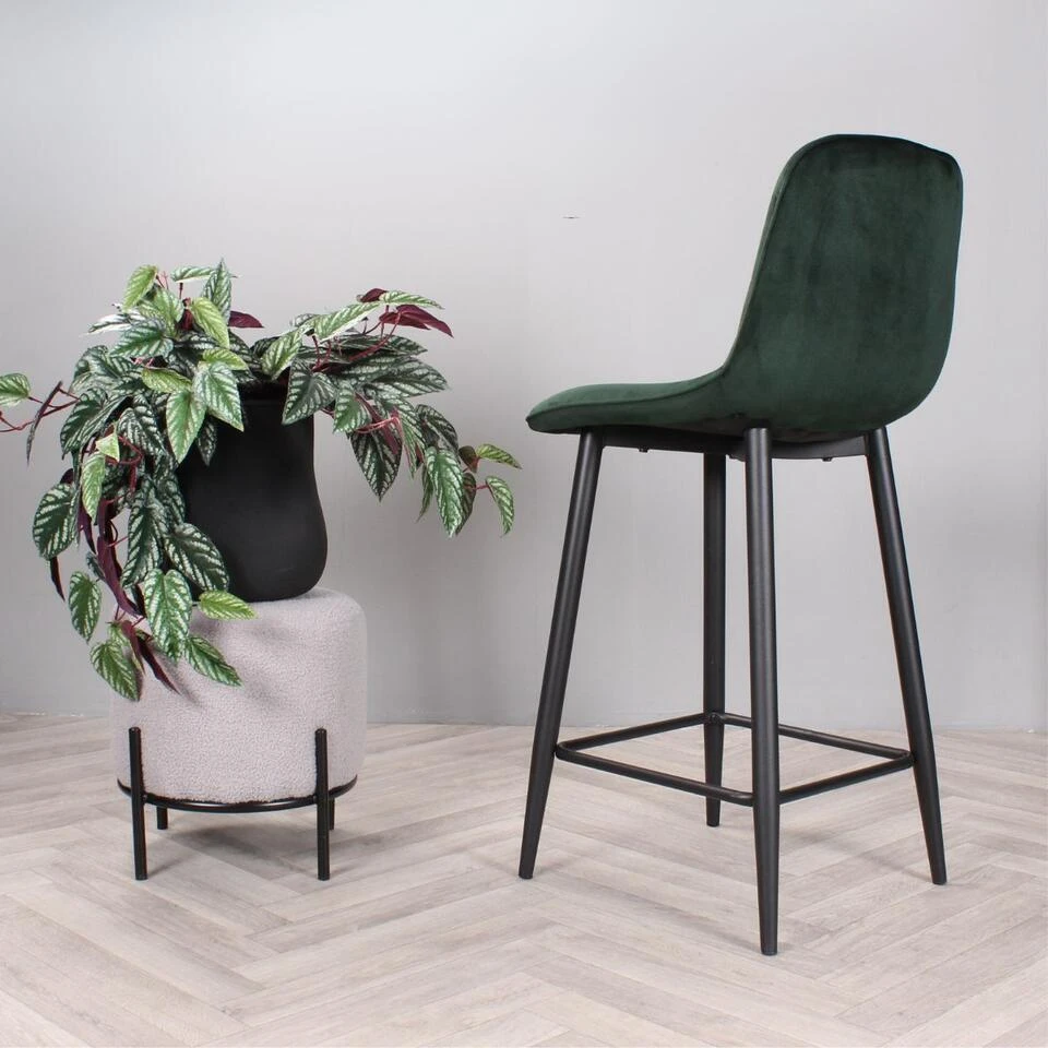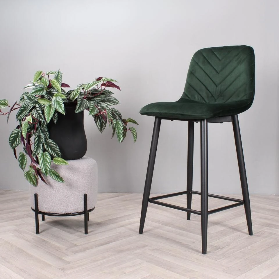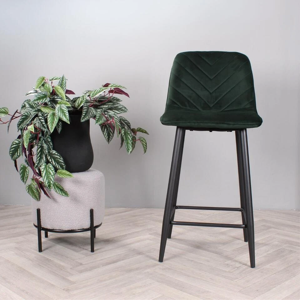 Geef uw interieur een stijlvolle en trendy make-over met barkruk Gaby uit onze eigen collectie! Deze prachtige barstoel is bekleed met een heerlijk zachte velvet stof. Gaby is verkrijgbaar in diverse mooie kleuren; groen, bruin, zwart, champagne en roze. Dankzij de halfhoge rugleuning en het zachte zitvlak, kan er heerlijk lang op deze kruk gezeten worden. Opvallend aan zijn ontwerp zijn de visgraat sierstiksels over de binnenzijde van de rugleuning voor een speelse finishing touch. Om dit exemplaar compleet te maken, is hij voorzien van vier stevige zwarte metalen poten met een handige voetensteun. Plaats barkruk Gaby aan het kookeiland en geniet van zijn design en comfort. Barkruk Gaby is verkrijgbaar in een zithoogte van 65 cm en 75 cm en ook als eetkamerstoel en armstoel in dezelfde mooie kleuren. Let op de kleuren van de eetkamerstoelen en barkruk kunnen afwijken. Zithoogte: 65 cm.