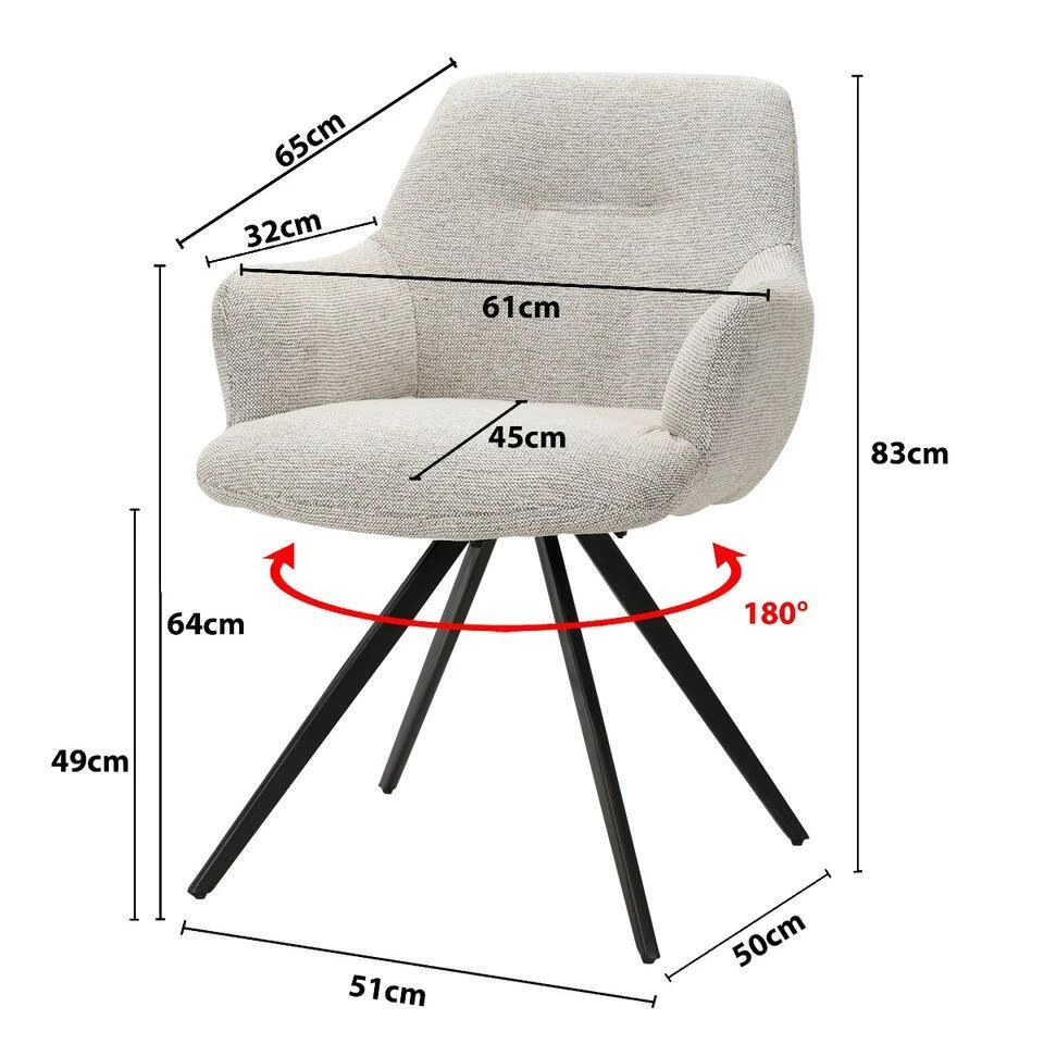 Met deze afmetingen past de Livingfurn Eetkamerstoel Doreen Sneak Beige perfect aan elke eettafel. Je kunt deze prachtige stoel kopen – Voeg deze eyecatcher toe aan je interieur en geniet van stijl en comfort!