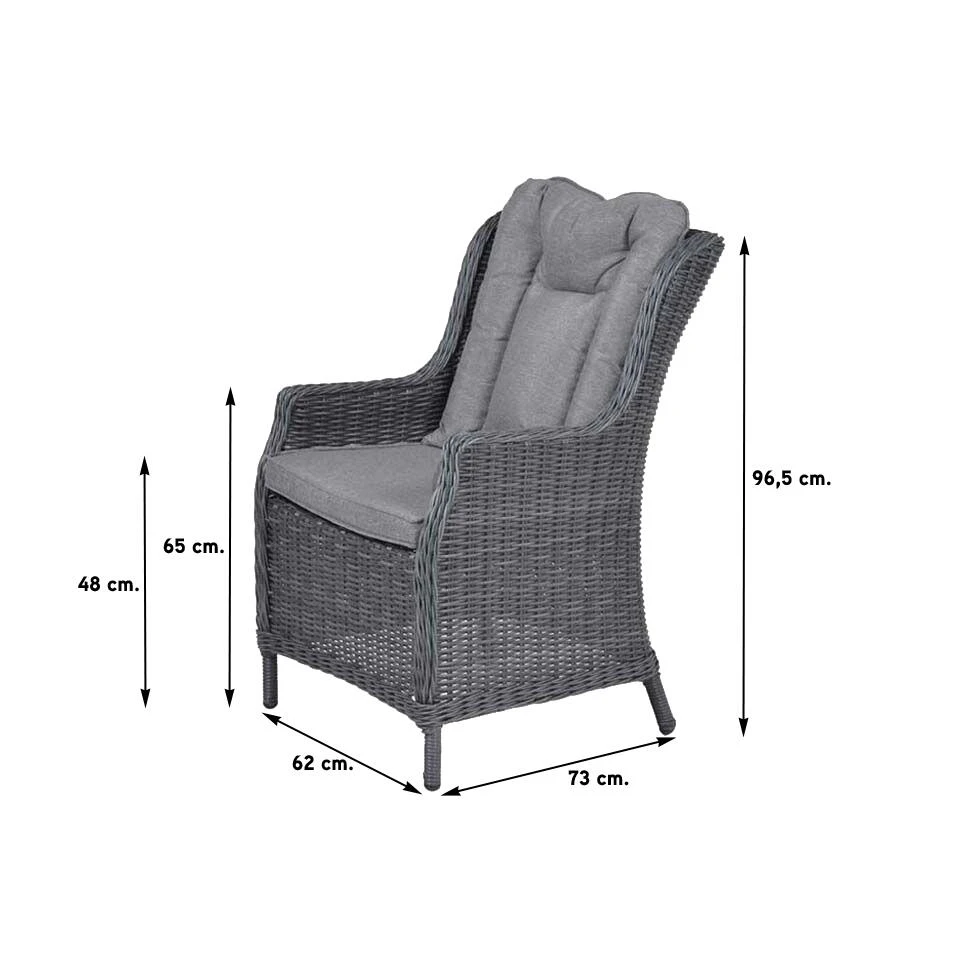 De tuinstoel wordt geleverd inclusief zachte kussens. Het rugkussen is voorzien van extra stiksels waardoor de stoel een extra chique uitstraling krijgt.