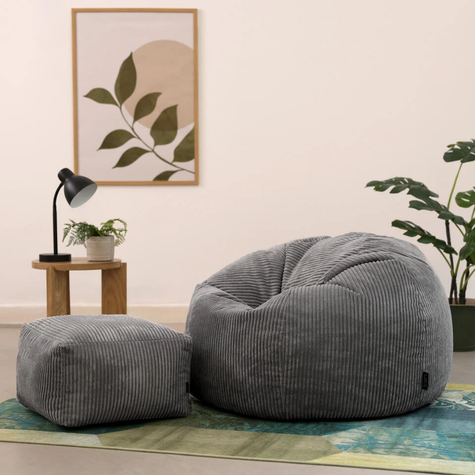 RELAX EN LEUN ACHTEROVER; Deze zitzakzetel is gemaakt om lang in te zitten, vervaardigd van superzacht corduroy en gevuld met precies de juiste hoeveelheid kralen voor een perfect ondersteunend inzakeffect.