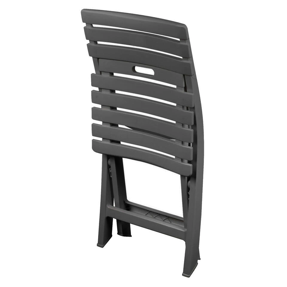 Klapstoel voor buiten en binnen in de kleur donkergrijs. Opvouwbare stoelen. Afmetingen: 41 x 40 x 79 cm. Deze handige bijzet stoelen zijn gemaakt van stevig kunststof. Deze stoeltjes zijn super handig op de momenten dat je extra gasten thuis ontvangt. De zitplaatsen zijn bijna altijd ontoereikend. De stoelen klap je na gebruik in en bergt ze weer op. Gewicht: 2 kilo.