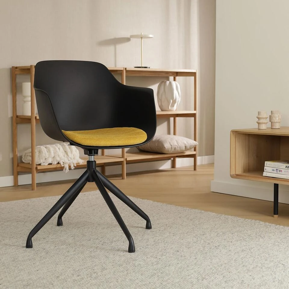 Het draaibare onderstel geeft de stoel een speels effect. Bovendien is de zitting bekleed met meerdere kleuren vaste zitkussens die voor extra comfort zorgen. Door de trendy kleuren zitkussens geef je de stoel een leuke frisse uitstraling. Kortom, zoek je een moderne eetkamerstoel die extra comfort biedt door het zachte zitkussens en de armleuningen? Dan is deze Nola draaibare eetkamerstoel zeker een kanshebber voor jou.