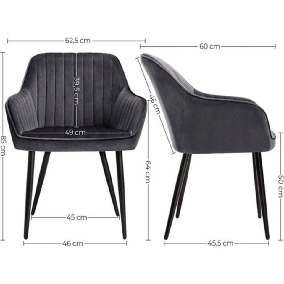Met totale afmetingen van 62,5 x 60 x 85 cm (lengte x breedte x hoogte) biedt deze stoel een ideale zithoogte van 50 cm en een zitbreedte van 49 cm, terwijl de zitdiepte van 44,5 cm zorgt voor optimaal comfort. De rugleuning heeft een hoogte van 39,5 cm, en de armleuningen zijn 64 cm hoog vanaf de vloer, wat bijdraagt aan een ontspannen zithouding. Het zitkussen is met een dikte van 7 cm extra comfortabel.