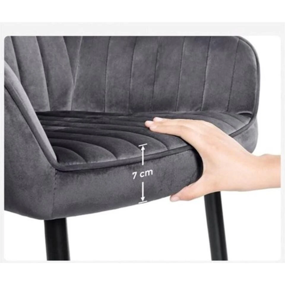 Deze elegante stoel is uitgevoerd in een verfijnd lichtgrijs, waardoor hij moeiteloos in elk interieur past. De combinatie van poeder-gecoat metalen benen, een stevig houten bord, luxe fluweel en een comfortabele schuimvoering zorgt voor een perfecte balans tussen stijl en functionaliteit.