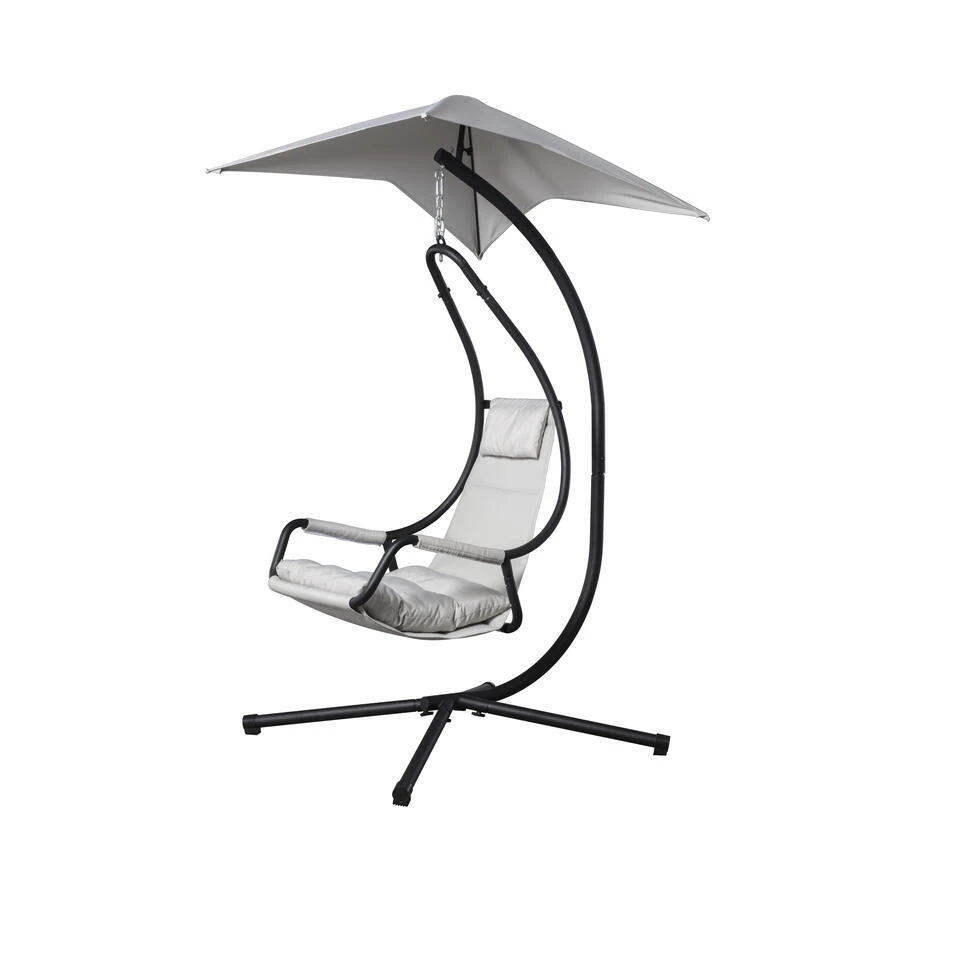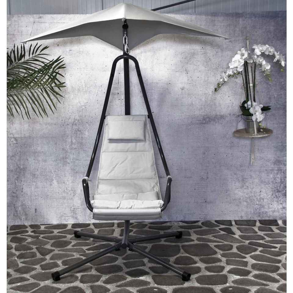 De SenS-Line Hangstoel Nico is een comfortabele toevoeging aan je tuin. Deze hangstoel beschikt over comfortabele kussens en neksteun waardoor je direct kunt genieten van een mooie zomerdag uit je luie stoel. Deze hangstoel is perfect uitgebalanceerd en voorzien van een uitklapbare parasol wat je van de felle directe zon weerhoud en schaduw geeft. De SenS-Line Hangstoel Nico heeft een donker metalen frame en de lichtgrijze kussens en parasol zijn van katoen en opgevuld met polyester. Onder het frame staan de poten op rubberen doppen waardoor de hangstoel stevig staat en geen krassen achterlaat op de terrastegel.