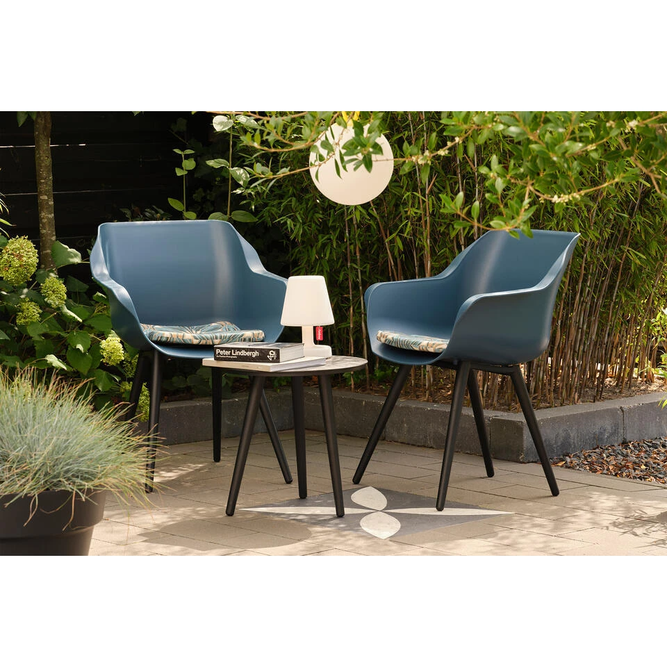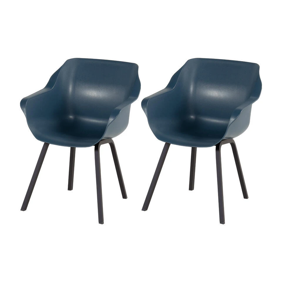 De Sophie Element armchairs stralen stijl uit dankzij hun donkerblauwe kleur. De diepe ‘Steel blue’ tint geeft een unieke touch aan elke tuin en maakt de stoelen ook geschikt voor je woonkamer of kantoor. Het moderne design en de brede armleuningen brengen een hedendaags gevoel, versterkt door het zwarte frame waarop de kuip rust. Ben je overtuigd? Bestel dan direct online!