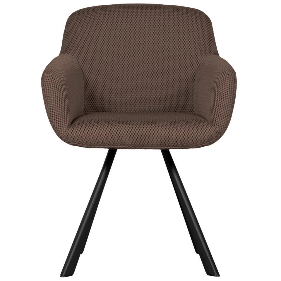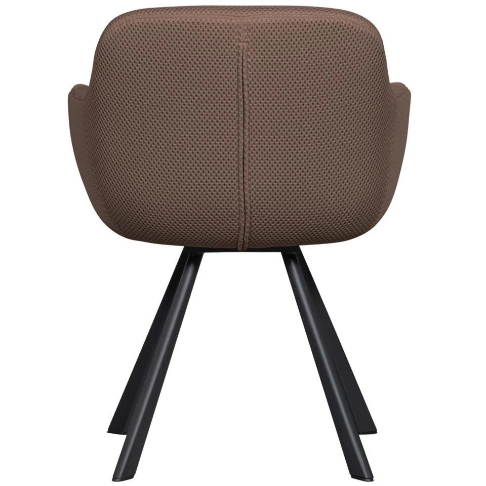 De Juno eetkamerstoel heeft metalen poten met een matzwarte poedercoating. De zitting is gevormd uit een stalen frame en multiplex, bedekt met een polyurethaan schuim. De zitting is bekleed met een mesh stof. Onze Wave gebreide mesh stof is een unieke toevoeging aan de meubelcollecties. De mesh stof heeft een opvallend 3D-effect en is van een zware kwaliteit. Met een samenstelling van 100% polyester en een Martindale van 100.000 is de stof van zeer sterke kwaliteit. De compact geweven backing zorgt dat het grafische patroon ten alle tijden in vorm blijft.